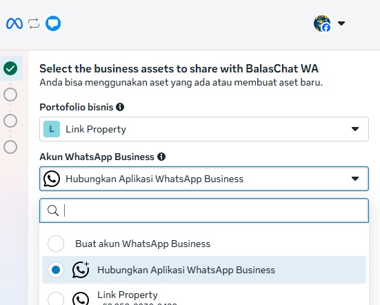 5a. Jika Anda Ingin Integrasi Whatsapp Business dengan WABA ( CoEx ), pilih hubungkan Aplikasi Whatsapp Business, dan ikuti Petunjuk selanjutnya dari Meta dan Selesaikan, termasuk add payment method.